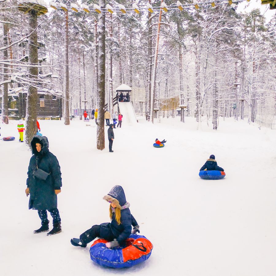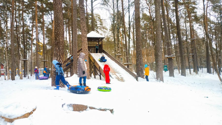 Морозный воздух, покрытые снегом сосны в парке - настоящая зимняя сказка, в которой так здорово мчаться с горки с радостным смехом вместе с друзьями!